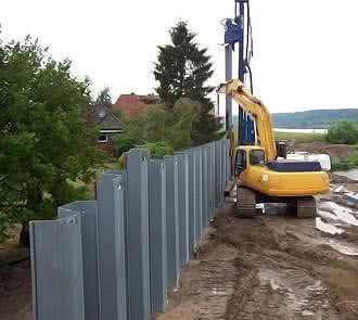 - Шпунты погружают в грунт по одному или парами, используя деревянные направляющие. На случай столкновения шпунтовой сваи с валуном ее основание усиливают.