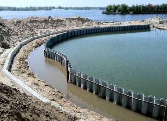 Возводим на территории водоёма стену из шпунта Ларсена, функция которой – создавать барьер для свободного перемещения воды. Аналог плотины, только с упрощенной конструкцией и рассчитанный на меньшие нагрузки